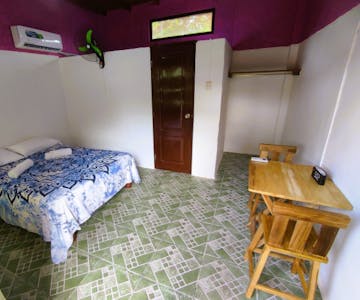 Maravillosa habitación Deluxe incluye cama Full Size, baño privado, AC, Smart TV y WiFi. Cocina comunitaria junto a la piscina
